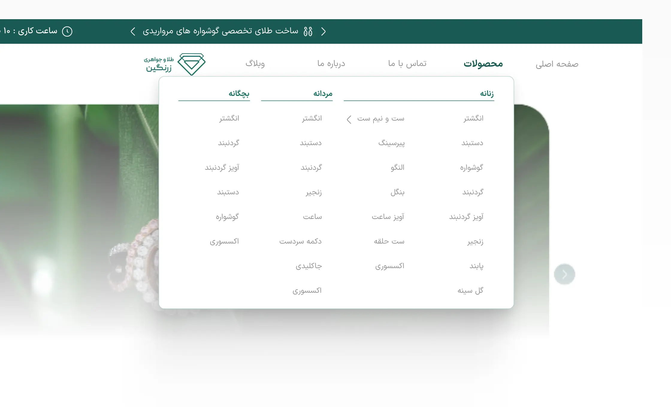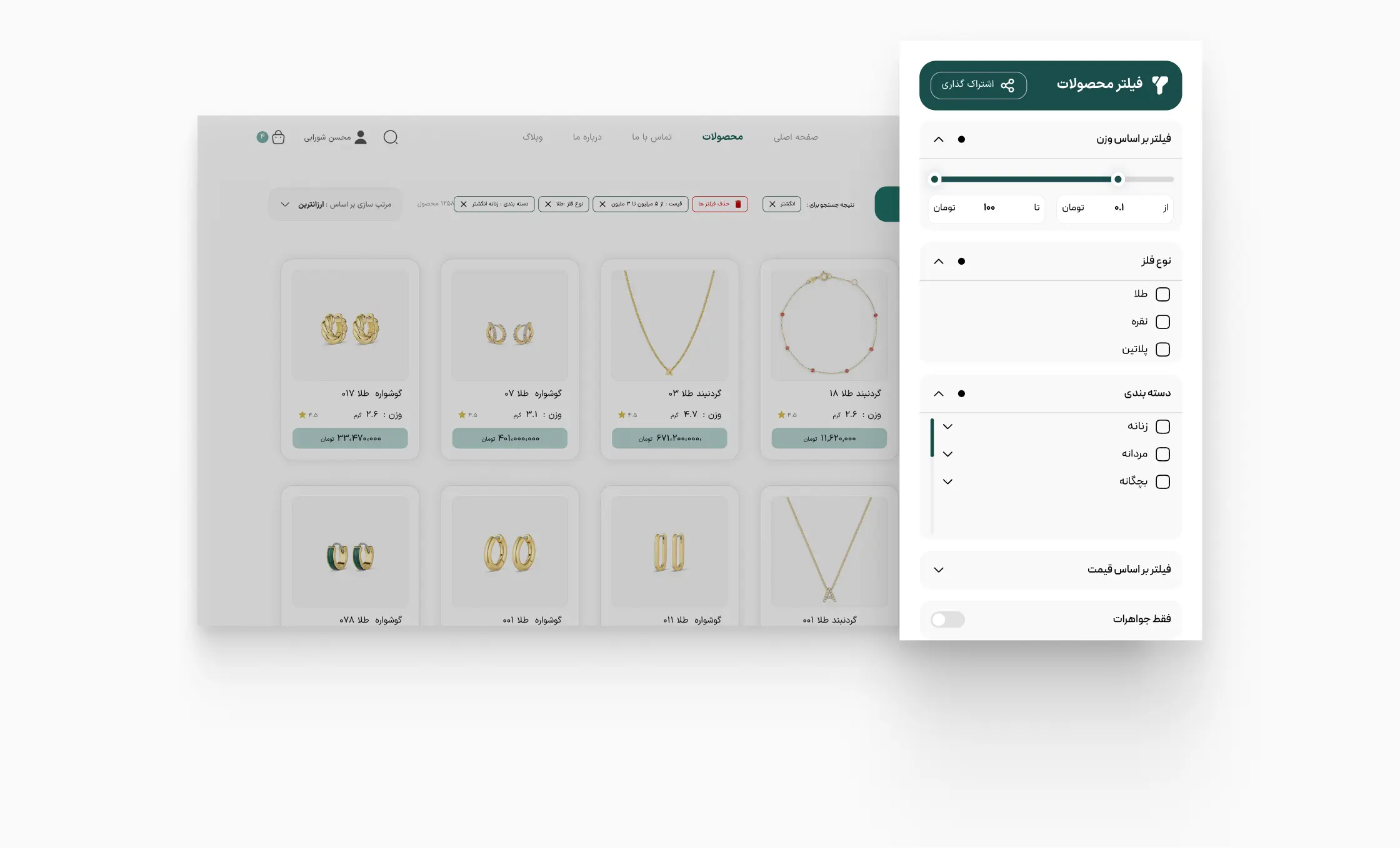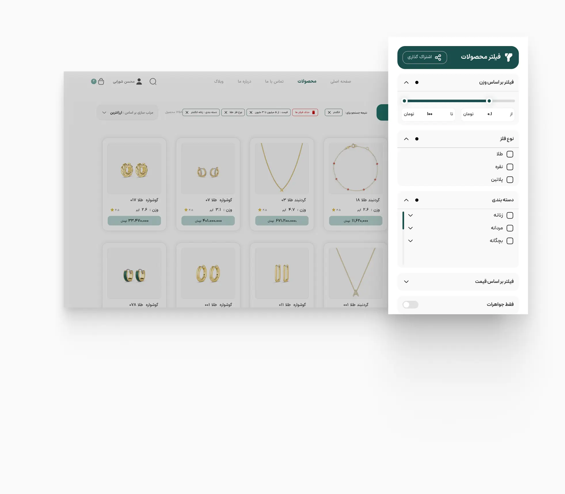 جستجو راحت محصولات با فیلتر های مختلف (وزن ، اجرت ، قیمت ، رنگ ، برند ، سنگ )